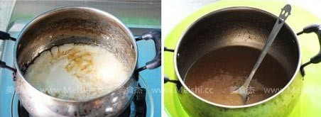 1:先把鍋刷干凈,在鍋里放入糖后,倒入30克冷水;將鍋用小火加熱。隨著熱度上升,糖會(huì)漸漸溶解,并開始冒出小泡,加熱的過程中不需要攪拌,切記!