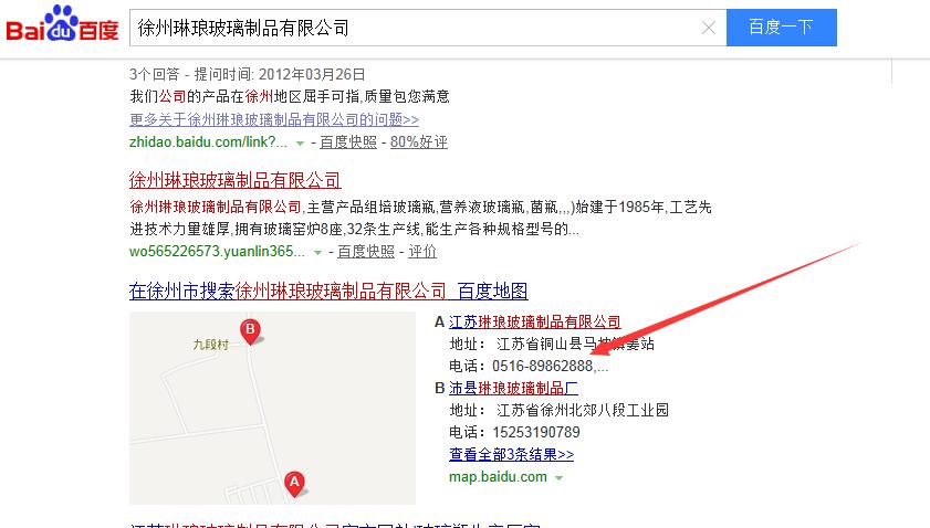 首先我們可以打開(kāi)百度,在百度上搜索徐州穩(wěn)健玻璃制品有限公司,然后查看百度地圖上的電話(huà),直接給玻璃瓶生產(chǎn)廠(chǎng)家打電話(huà),如圖: